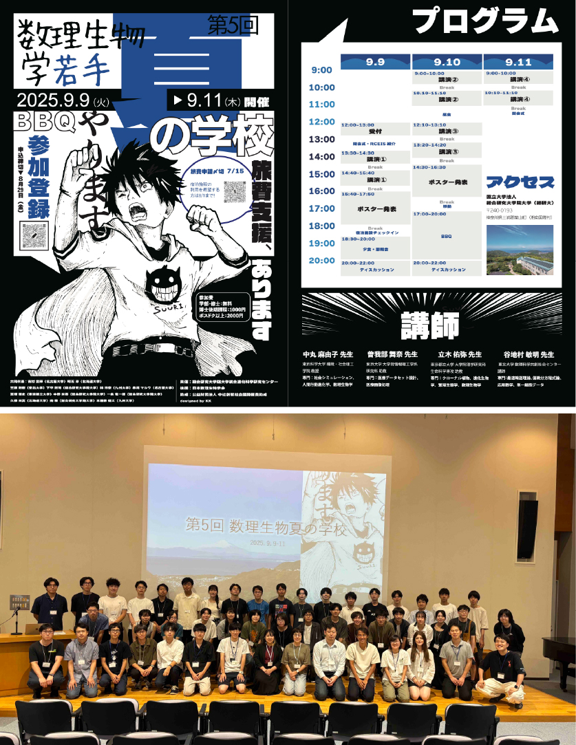 We held the “5th Summer School on Mathematical Biology” at the Hayama Campus of the Graduate University for Advanced Studies (SOKENDAI) from September 9 to 11, 2025. This summer school was organized by young researchers who have a strong interest in mathematical biology and aimed to provide opportunities to learn fundamental theories across diverse fields, foster interaction among participants, and promote new collaborative research. This summer school has been held four times in the past.