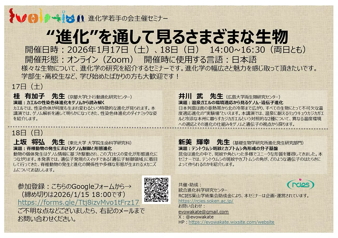 January 17-18, 2026, a seminar hosted by the Young Researchers in Evolutionary Biology (online seminar) was held. This academic meeting was co-sponsored by the RCIES.
